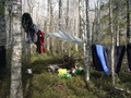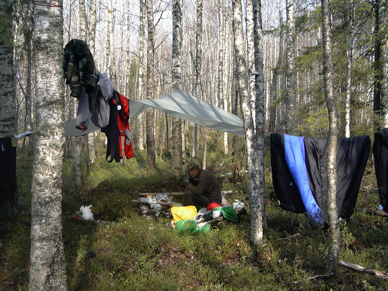 СтоянкаПроснулся рано. Внутри палатки конденсат - надышали, да еще и влажность высокая. Завтракаем кашей с курагой и финиками - наконец-то они закончились. Облачность становится переменной. Солнце выглядывает все чаще, начинает припекать. Сушим влажные спальники. Женька отыскал родник и расчистил его. Пьем чай со сгущенкой и собираемся.