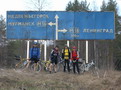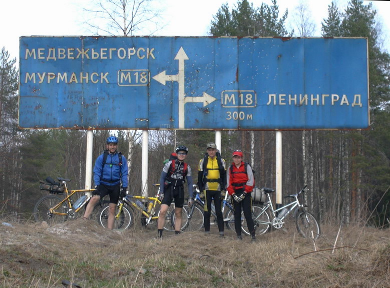 ГруппаКатим очень быстро и бодро, почти не останавливаясь. Заехали в Кумсе в магазин. Купили минералки и пива. Магазин прямо в доме одной семьи местных жителей. Пивом заправились прямо на месте. Едем дальше. Вот и указатель перед мурманской трассой. Фотографируемся. Делаем групповое фото. Щелк. Затвора цифровика не слышно, поэтому стоим нешелохнувшись и считаем на всякий случай до 10 :)))